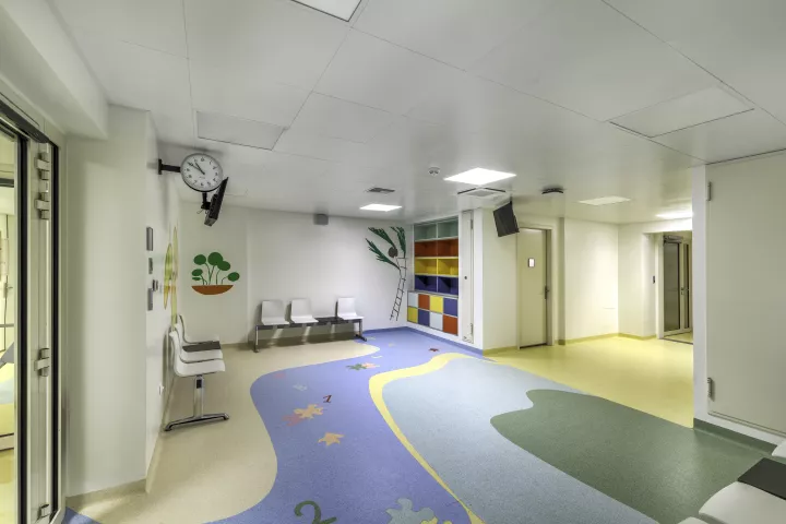 (Χώρος αναμονής στο Ωνάσειο Παίδων. Εδώ, χτυπά η «καρδιά της καρδιάς» για τους μικρούς ασθενείς. Οι τοιχογραφίες, η βιβλιοθήκη και τα στοιχεία διακόσμησης συνθέτουν ένα περιβάλλον θαλπωρής και αισιοδοξίας / ONTRC ©Stelios Tzetzias)